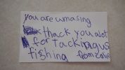 Finally some salmon. Great to see a family out fishing together. She is one good fisher gal and a pleasure to have on the boat. She left a message for Tim. See the next photo. That's why we love what we do.